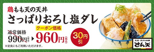 「天丼・天ぷら本舗 さん天」公式アプリでは、販売期間中に使える「鶏もも天フェア 30円引きクーポン」を配信いたします。会員の方限定でご利用いただけるクーポンですので、この機会にぜひ「天丼・天ぷら本舗 さん天」公式アプリをダウンロード&会員登録ください。