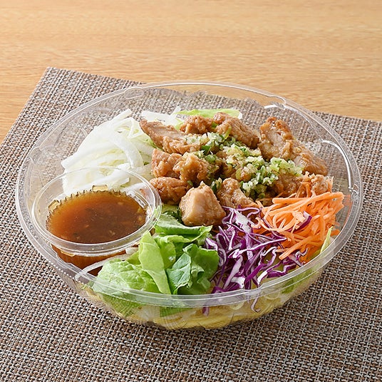 【内容】食べごたえのある中華麺に、8種類の野菜と油淋鶏を乗せたボリューム感あるサラダです。冷たいままでも柔らかな鶏唐揚げを使用し、レモンや酢の酸味・生姜をきかせたさわやかなドレッシングを合わせました。