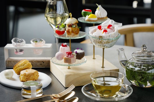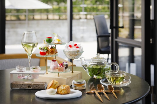 白桃とフランボワーズのババ、スイカのパルフェグラス、麦わら帽子をかたどったマンゴーのムースなど、宝石のようにカラフルで目にも美しい夏の果実を贅沢にあしらったアフタヌーンティーをご提供いたします。北山杉をモチーフにしたティースタンドに美しく飾られた全 16 種のスイーツとセイボリー。ジューシーな白桃の甘みとフランボワーズの爽やかな酸味が程よく重なる「ピーチメルバ ババ」は一口頬張るとふわっと優しい余韻に包まれます。また「京都舞コーンとチーズのスコーン」や「穴子の手鞠寿司」など旬の美味を活かしたセイボリーもご堪能いただけます。摘みたての爽やかなフレッシュハーブティーとともに、夏風そよぐ山麓で優雅な午後のひとときをお過ごしください。