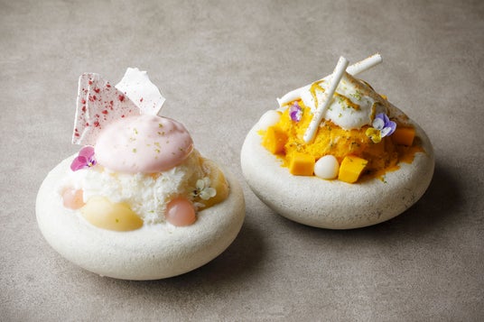 新食感、新感覚。口どけなめらかなシェイブアイスとパフェが融合した「夏 麓 氷(なつ ろく ごおり)」を夏季限定で今年もご提供いたします。今年は人気のフレーバー 2 種を新たなアレンジでご用意します。【白桃】は華やかなヨーグルト氷とフレッシュな白桃と赤桃を添え、氷の中には桃ソルベを。食べ進めるごとに桃づくしの甘いハーモニーが広がります。【芒果(マンゴー)】は濃密な甘みのアップルマンゴーを贅沢にあしらい、ココナッツのエスプーマとアイスを添え、トロピカルに仕立てました。
