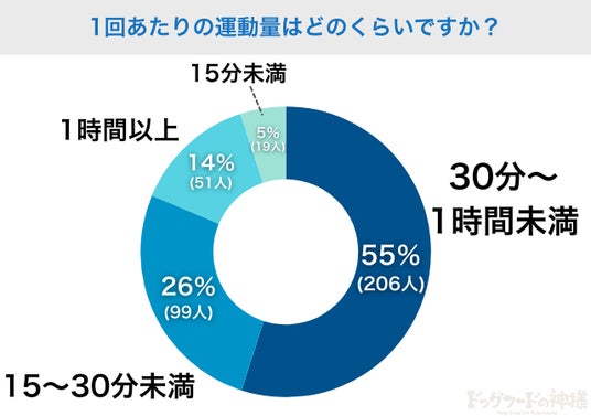 運動習慣がある方のうち、約55%が「30分以上1時間未満」と回答し、「15分以上30分未満」と合わせると全体の約8割にのぼりました。小型犬が多い日本ならではの傾向と言えそうです。