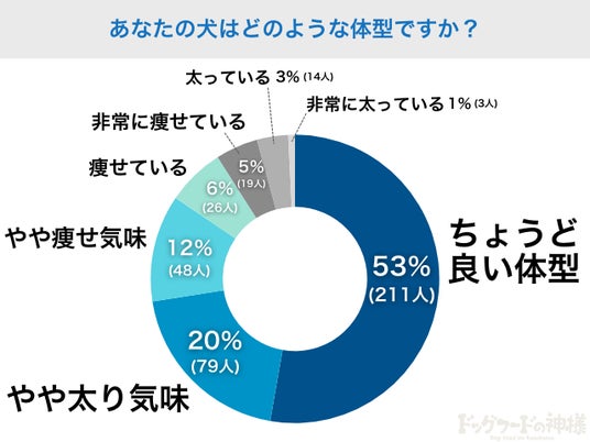 愛犬の体型が「ちょうど良い」と感じている飼い主さんの割合は53%でした。次いで多いのは「やや太り気味」の20%。