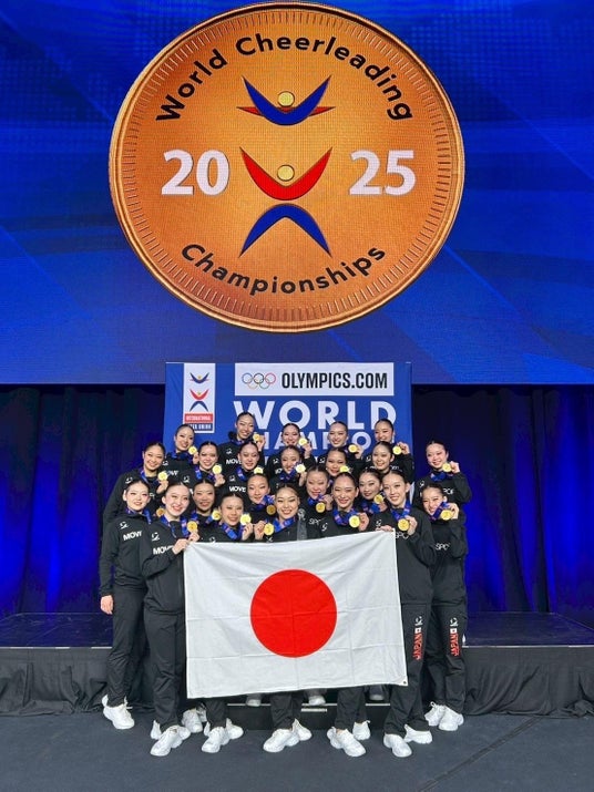 日本女子体育大学ソングリーディング部GRINSは、この春にアメリカ・フロリダ州で開催された「2025 ICU世界チアリーディング選手権大会」のパフォーマンスチア ジャズ部門で優勝(写真)