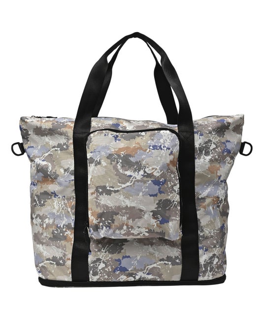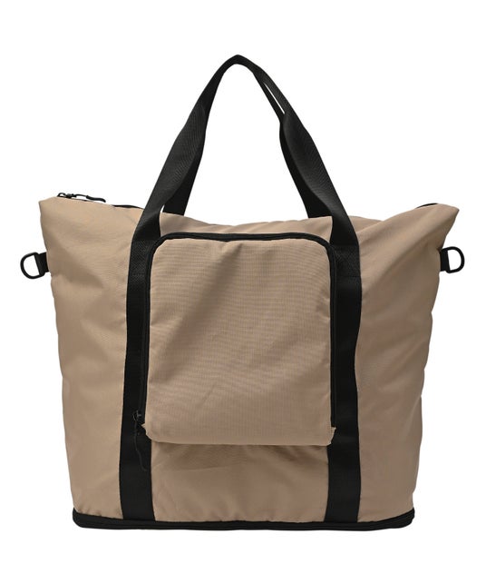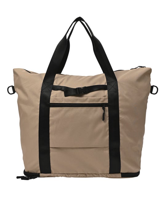 キャリーケースに固定可能なパッカブル大容量トート。シューズ収納にも対応した便利な構造。