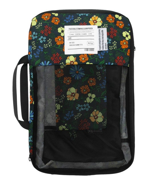 ファスナーで圧縮できる整理整頓パッカブルポーチ。Tシャツ最大15枚収納可能。前後収納付き。