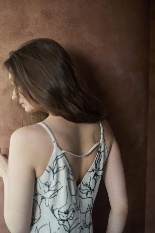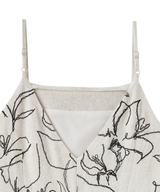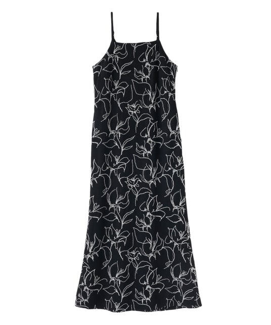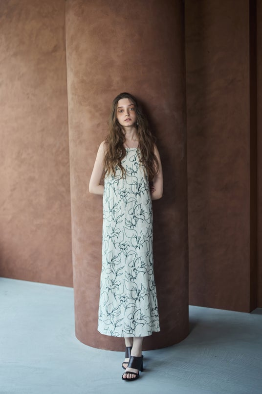 全体に描かれた線画の花柄が印象的な、麻入りのノースリーブロングワンピース。