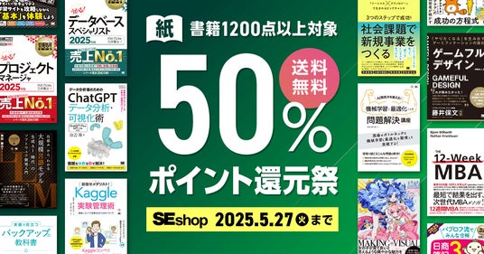 SEshopは、IT書・ビジネス書をはじめ、資格書や実用書まで幅広いラインナップを展開する翔泳社の公式通販サイトです。5月27日(火) まで、紙版の対象書籍を購入すると、本体価格の50%をポイント還元するキャンペーンを開催します。貯まったポイントは1ポイント=1円として次回のお買い物から使えます。新刊含む1200点以上のタイトルが対象となります。