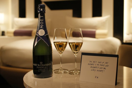 今回の宿泊パッケージでご用意するのは、ファレル ウィリアムス氏とモエ・エ・シャンドンのコラボレーションによってデザインされた限定ボトル「モエ アンペリアル ファレル ウィリアムス」。ファレル氏オリジナルのバースデーメッセージカードに、チェックインの際お撮りする記念写真を添えて、お部屋にお届けいたします。