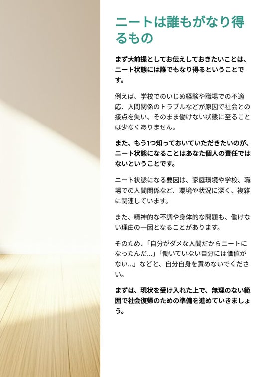 ご本人はもちろん、「家庭内にニート状態の家族がいて心配…」というご家族にもおすすめの内容です。