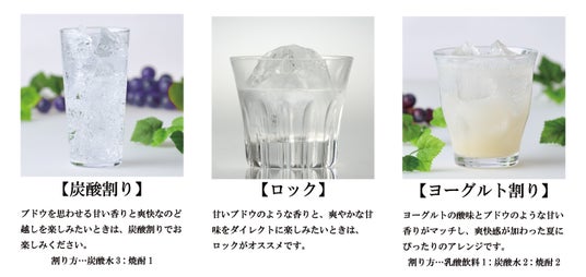 今回、原料に「コガネセンガン」と「清酒酵母」を使用することで、ブドウのような風味を連想させる爽やかな甘い香りを実現しました。ブドウのような香りと爽やかなキレを楽しみたいときは「炭酸割り」、濃厚な甘味をダイレクトに楽しみたいときは「ロック」がオススメです。いつもと違った楽しみ方もご提案いたします。