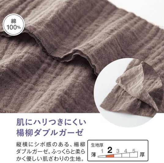通気性・吸湿性が高い楊柳ダブルガーゼを使用しているので、汗ばむ季節でもサラッとした着心地。軽くて柔らかく、綿100%なので敏感肌の方も安心です。洗うほどに風合いが増すので、長くご利用いただけます。ナチュラルで涼し気な素材感が、いつものスタイルにプラスするだけで夏らしいコーディネートを演出します。