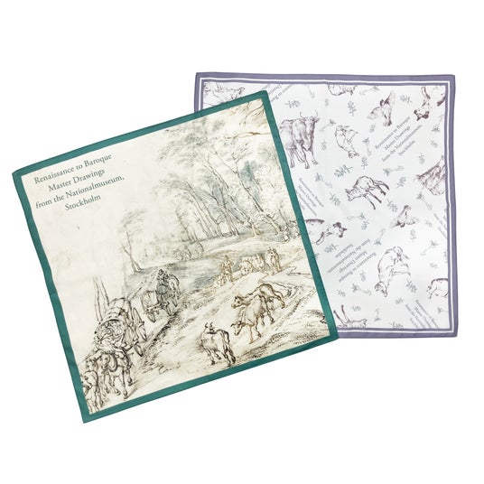 本展に出品されるヤン・ブリューゲル(父)《旅人と牛飼いのいる森林地帯》をあしらった上品なグリーンカラーと、コルネリス・フィッセル《眠る犬》をはじめとした動物たちの素描を散りばめた柔らかいモーヴカラーの2種類を販売します。