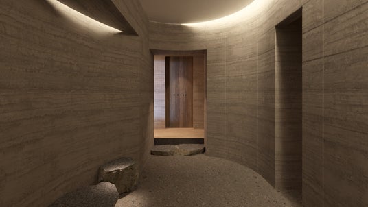 地層のような土壁の表情と、柔光のリズムが調和する、静けさに包まれたサロン