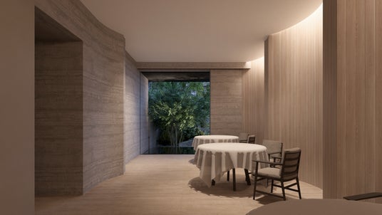 古代中国の自然哲学〈五行〉をコンセプトに据えた空間では、壁・床・家具に四角や円の規則的な模様をあえて用いず、“完結しない美” をそのまま残しました。左官職人・久住有生(くすみ なおき)が手掛けた壁や、地中に約五百年眠っていた神代欅を用いた家具などが静かに佇みます。余白が生む自然のゆらぎの中で、心をほどき、食と向き合う時間をお楽しみください。