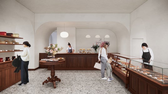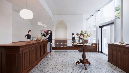▲じっくりと商品を見てお選びいただけるよう、店内は白をベースとし落ち着いた雰囲気に。3mのガラスのショーケースに多彩な洋菓子が並びます。※パースは2025年5月現在のイメージです