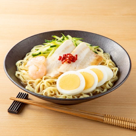 平打ち麺に甘酸っぱいスープが特長である呉風の冷麺です。ピリッとした酢辛子がアクセントです。エビやチャーシュー、玉子などを盛り付け、具だくさんに仕上げました。