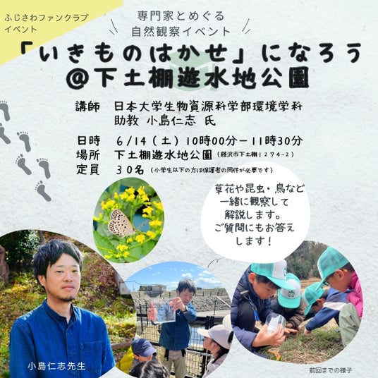 「ふじさわファンクラブ」(藤沢市)では、ふじさわファンクラブ会員を対象に、藤澤の自然に触れ、環境意識を高め、地元への愛着をより深めてもらうための参加型イベント「ふじさわの【いきものはかせ】になろう!」を藤沢市内の公園を会場に開催していますが、今年3月遠藤笹窪谷公園での開催に続き、6月14日(土)にも、下土棚遊水地公園にて開催することとなりました。藤沢市シティプロモーションの一環での開催です。