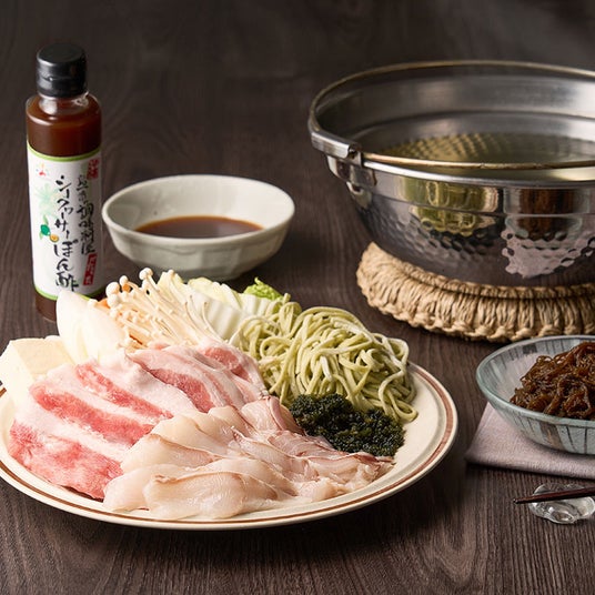 【内容】沖縄県産のかつお削り節でダシを取ったスープで、ぷちぷち食感の「海ぶどう」、脂の旨みあふれる「あぐー豚」、淡白で上品な高級白身魚「ミーバイ(ヤイトハタ)」などの沖縄ならではの具材を、シークヮーサー入りのポン酢でさっぱりとお召し上がりください。
