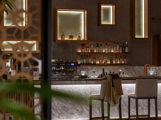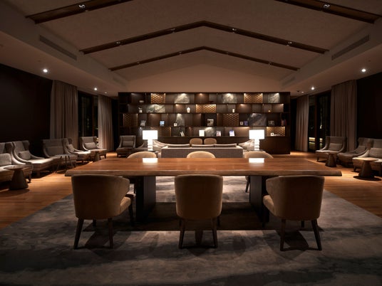 一日の様々なシーンに合った寛ぎ方、過ごし方をお楽しみいただける空間。ゆったり座れるラウンジチェアでランチ、アフタヌーンティー、バータイムまでお過ごしいただけます。江戸小紋の桜亀甲紋と薩摩島津家の家紋「丸に十字」をあしらった間仕切り「KOMMON SCREEN」や、切子細工を表現した壁面アート「KIRIKO WALL」など、歴史あるこの土地の記憶を思い起こさせる粋なインテリアが寛ぎのひとときに華を添える。