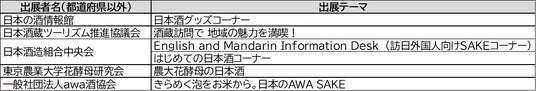 全国45都道府県から各都道府県酒造組合(連合会)の試飲ブースが出展され、風土や文化などその地域ならではのテーマを掲げ、自慢の日本酒と蔵元が一堂に会し全国の日本酒を楽しむことができるほか、日本酒の販売や全国のおつまみの試食・販売も予定しております。また、日本酒のバラエティや温度による味わいの変化を体験できる「はじめての日本酒体験コーナー」を設置するほか、訪日外国人向けのSAKEコーナー、近年注目を集める酒蔵ツーリズムコーナーの併設など、日本酒にまつわる話題のトピックスもご紹介いたします。