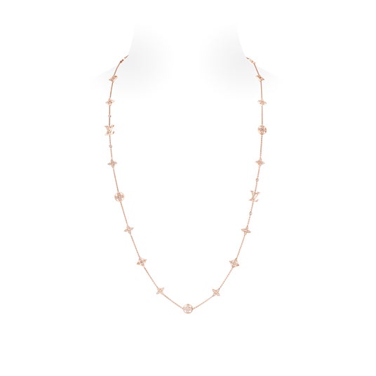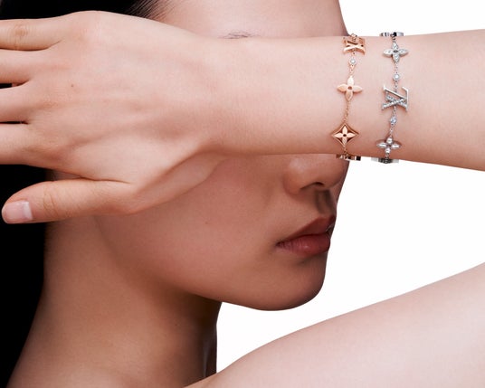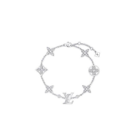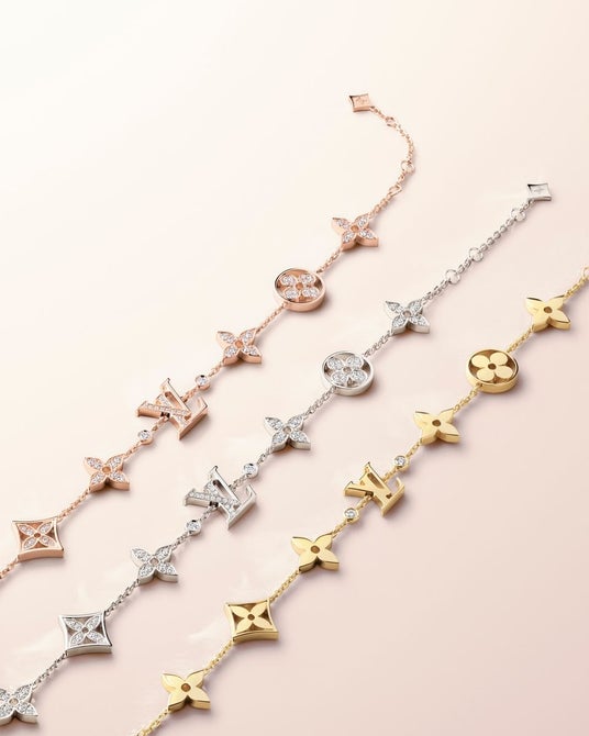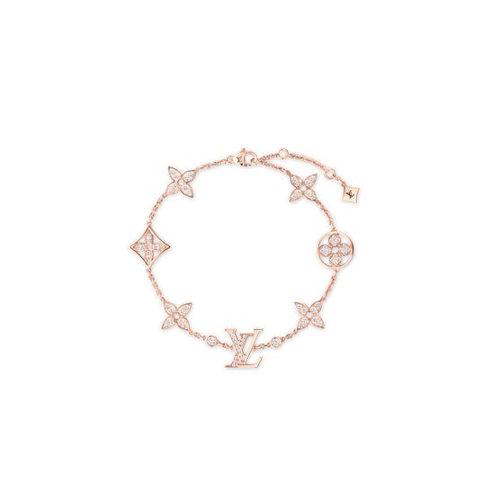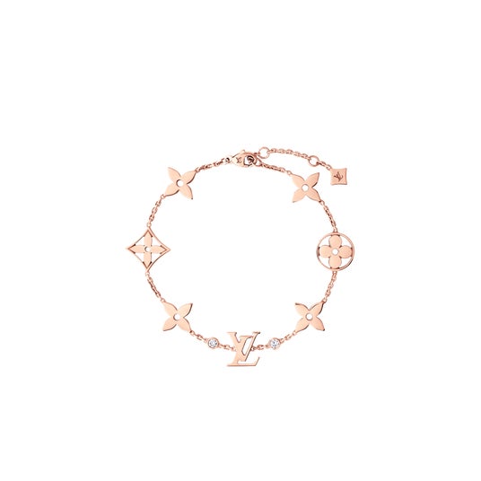 ピンクゴールドのブレスレットには、ベゼルセッティングでダイヤモンドが2石あしらわれ、魅惑的なフラワー・モチーフを上品に彩ります。また、きらめくパヴェセッティングのダイヤモンドが輝きを放ち、モノグラム・フラワーの魅力をさらに引き立てるブレスレットは、ピンクゴールドとホワイトゴールドの2色で展開。LV イニシャルは、柔らかな光を放つジェムストーンとポリッシュ仕上げのプレシャスメタルが奏でる洗練されたハーモニーによって、エレガントなコントラストを生み出しています。