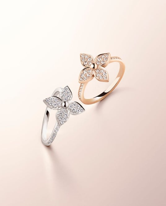 ルイ・ヴィトンのエンブレマティックなシグネチャーであるモノグラム・フラワーが、ファインジュエリー・コレクション「イディール ブロッサム」で花開いたのは2012年のこと。ジョルジュ・ヴィトンが1896年に考案したモチーフがさまざまに解釈されたこのプレシャスなファインジュエリーのコレクションは、単体または重ね着けなど、多彩なスタイルが楽しめるデザインが特徴です。