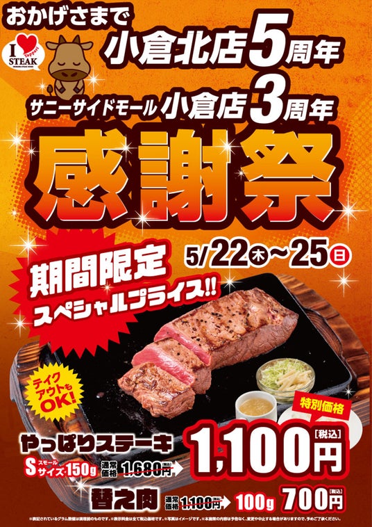 【やっぱりステーキ】小倉北店・サニーサイドモール小倉店で周年祭を開催!やっぱりステーキ(ミスジ)を22日(木)から4日間限定で特別価格で販売!