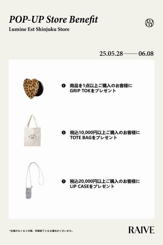 ・商品1点以上お買い上げの先着40名様にRAIVE LEOPARD GRIPTOKをプレゼント