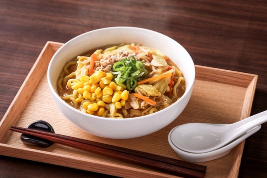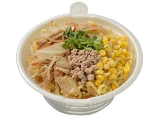 玉ねぎ、もやし、キャベツ、人参の野菜炒めは、前回より増量することで食べ応えがアップしました。味噌ラーメンのトッピングには欠かせないコーンと青ねぎも盛り付けています。