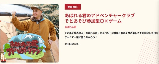 さらにはイベントを盛り上げるゲストたちも登場。24日(土)13:20からは、子どもたちに大人気のよしお兄さんがステージに。キャンプ体操で大人も子どもも楽しめます。また、同日14:30からは、そとあそびの達人で芸人のあばれる君が登場するそとあそび〇×ゲームを開催。是非ご来場ください。
