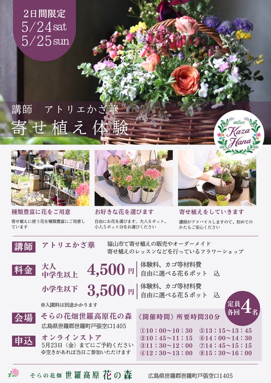 【料金】大人4,500円/小学生以下3,500円(体験料、材料、花ポット込)