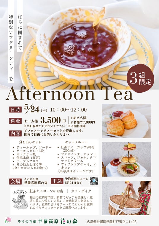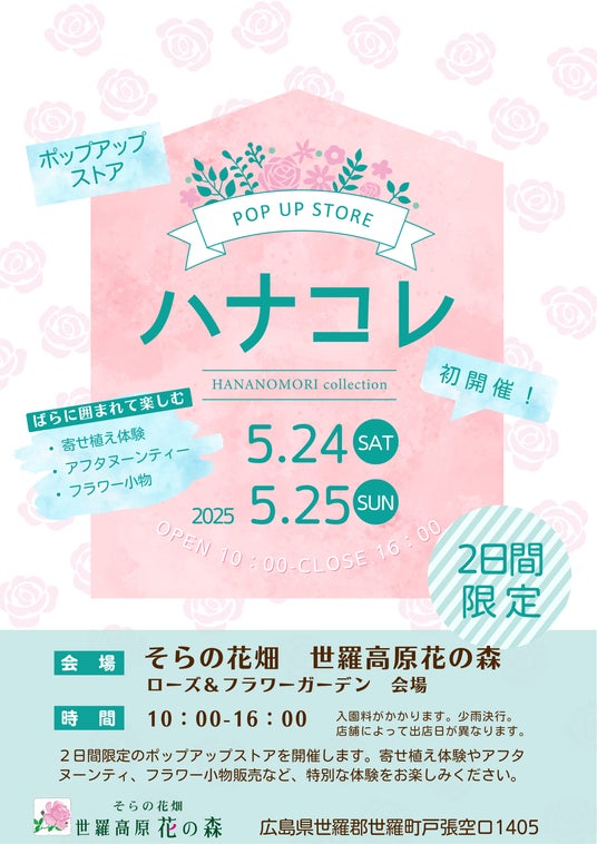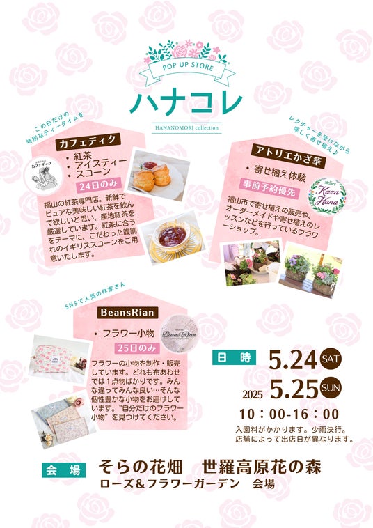 「ローズ&フラワーガーデン」を開催中のそらの花畑世羅高原花の森では、2日間限定でポップアップストアを開催します。紅茶やスコーン、ばらの布小物、寄せ植え体験など、ガーデンをより楽しめる出店者が集まります。