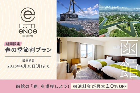 ホテルエノエ函館では、春の旅行シーズンに向けて、お得にご宿泊いただける「春の季節割プラン」の販売を開始いたしました。通常宿泊料金から最大10%OFFの特別価格でご予約が可能です。[プラン名] 【期間限定】ホテルエノエ函館 春の季節割プラン(素泊り)