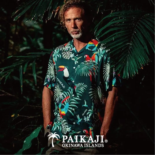 「パイカジ」とは、沖縄の言葉で「南から吹く風」を意味します。使用されているプリントデザイン(柄)はすべてオリジナルで、アロハシャツのほとんどは沖縄の自社工場で生産され,沖縄を訪れるツーリストにも高い人気を誇ります。