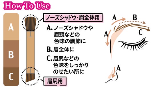 ペンシルやパウダー・眉マスカラなど、普段お使いのアイブロウアイテムの色味に合わせて、同系統の本品を選ぶのがおすすめです。組み合わせることで、各アイテムの発色がよりキレイに仕上がります。
