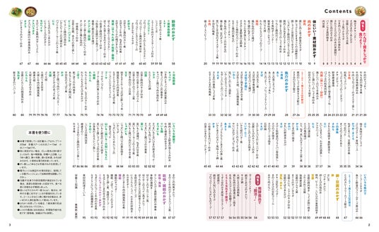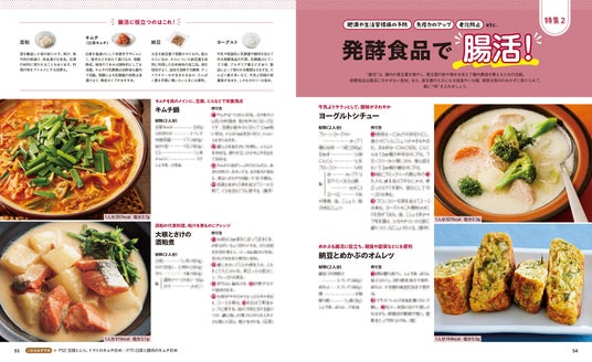 発酵食品は腸活に欠かせない食材です。そこで特集2では、発酵食品を使った腸活に役立つレシピを紹介しています。「腸活」とは腸内の善玉菌を増やし、悪玉菌の数や働きを抑えて腸内環境を整えるための活動です。発酵食品だけでなく、善玉菌のえさになる海藻類やいも類、根菜類などを毎日のおかずに取り入れてさらに効果アップ。また、すべてのレシピに1人分のカロリー、塩分を表示しているので、健康のため、カロリーが気になる方や、塩分量を気にしている方も安心です。