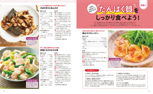 巻頭の特集1ではたんぱく質量が多い食材を使って、一品で15g以上のたんぱく質が摂れるレシピをピックアップしています。
