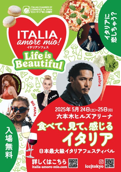 在日イタリア商工会議所(東京都港区三田4-1-27 FBR三田ビル9階 /事務局長 ダヴィデ・ファントニ) は、5月24日(土)25日(日)東京・六本木ヒルズアリーナ(会場:東京都港区六本木6-10-1)にて 日本最大級イタリアンフェスティバル「Italia, amore mio!(イタリア・アモーレ・ミオ!)2025」を開催 します。今年のイベントのテーマは「Life is Beautiful」日本からも多彩なゲストが登 場して、音楽やトークで会場を盛り上げます。“La Vita e Bella(人生は美しい)”を思う存分 体感できる魅惑の2日間。六本木ヒルズがイタリア一色に華やかに染まるイベントをお見逃しなく。