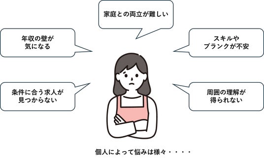 一方で、家庭との両立、就業ブランク、年収の壁、条件に合う求人が見つからないなど、さまざまな制約がハードルとなり、実際に行動に移せていないケースも少なくありません。