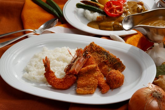 有頭海老のフライ、蟹のコロッケ、サーモンフライ、アジフライ、穴子フライ、5種の魚介フライをホテル伝統のカレーソースで贅沢にお楽しみいただけるフェア限定メニューです。