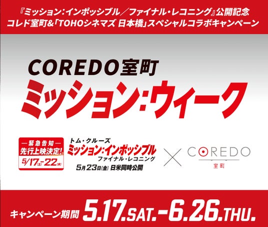 5月23日(金)『ミッション:インポッシブル/ファイナル・レコニング』の劇場公開を記念しコレド室町&「TOHOシネマズ 日本橋」スペシャルコラボを実施!オリジナルノベルティ がもらえるクイズラリーや、スパイにちなんだ限定“スパイ”スメニューの実施など、コレド室町が『ミッション:インポッシブル/ファイナル・レコニング』一色に!ぜひこの機会にコレド室町でお楽しみください!