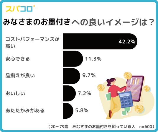 ”みなさまのお墨付き”に対する良いイメージは「コストパフォーマンスが高い」(42.2%)、「安心できる」(11.3%)、「品揃えが良い」(9.7%)となりました。