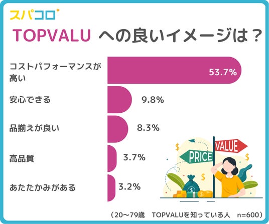 ”TOPVALU(トップバリュ)”に対する良いイメージは「コストパフォーマンスが高い」(53.7%)、「安心できる」(9.8%)、「品揃えが良い」(8.3%)となりました。