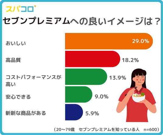 ”セブンプレミアム”に対する良いイメージは「おいしい」(29.0%)、「高品質」(18.2%)、「コストパフォーマンスが高い」(13.9%)となりました。