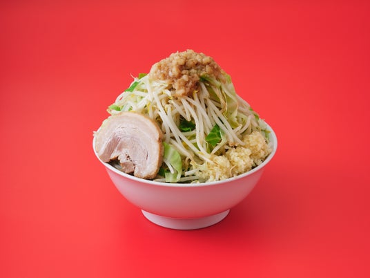 画像:ラーメン(全増しトリプル)。無料トッピングで驚きの量に!