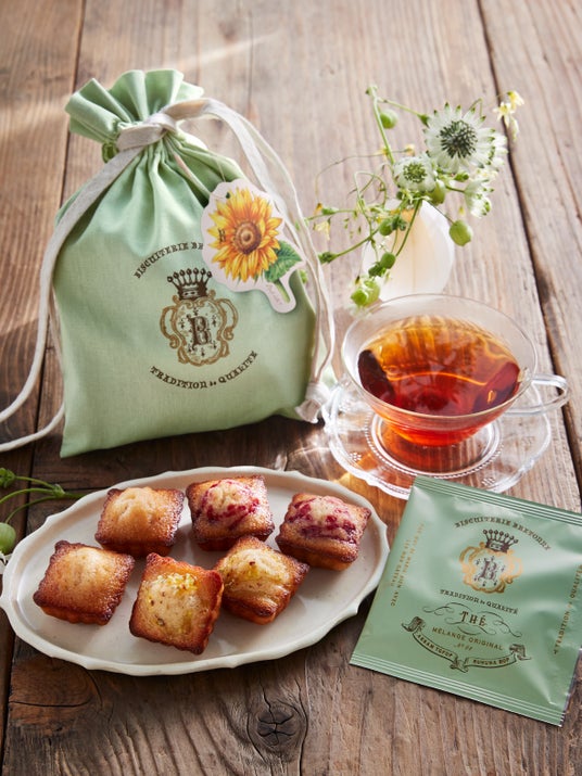 定番人気の〈プレーン〉〈フランボワーズ〉とセットにして、オリジナルブレンド紅茶と一緒に、グリーンのオリジナル巾着に詰め合わせました。ひまわりの カード付きで、夏の贈り物にもぴったりです。爽やかな夏のティータイムをお楽しみください。