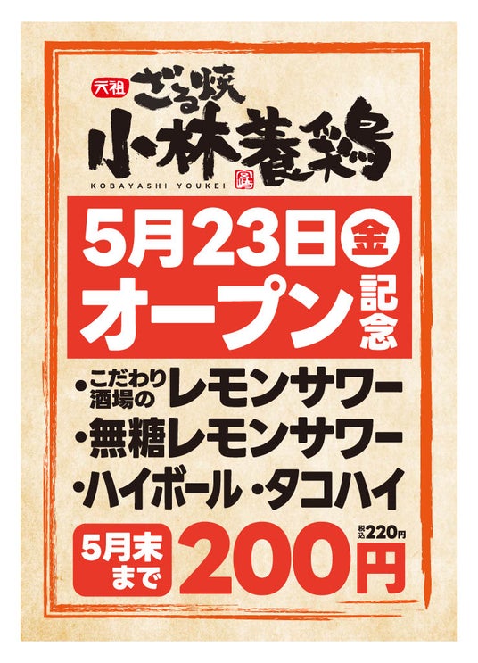また、『元祖ざる焼 小林養鶏 溝の口店』のオープンを記念し、2025年5月23日(金)~ 31日(土)の9日間、「ハイボール」・「こだわり酒場のレモンサワー」・「こだわり酒場のタコハイ」・「無糖氷結サワー」を、何杯飲んでも 1杯200円(税込220円)にてご提供いたします。