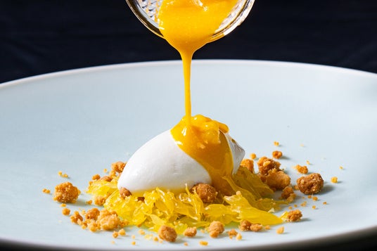 旬の八朔とココナッツアイスに、杏仁風味のクランブルを添え、マンゴーソースとタピオカをたっぷりとかけた華やかな一品。