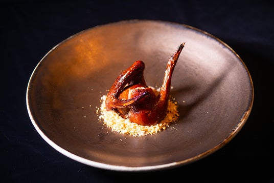 和食の技法"のぼり串"を取り入れた「稚鮎の椒麻ソース」、伝統製法に着想を得た「林檎の北京ダック」、そしてスペシャリテ「広州産乳鳩のフォアグラ包み焼き」など、新しい表現の数々が並びます。