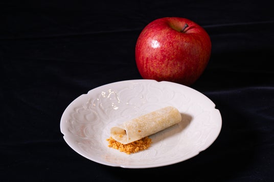 北京ダックといえば、胡瓜と葱を添えるのが一般的ですが、当店では芽葱と胡瓜の代わりに林檎を使用。みずみずしい酸味と自然な甘みが鴨肉の旨味を引き立てます。